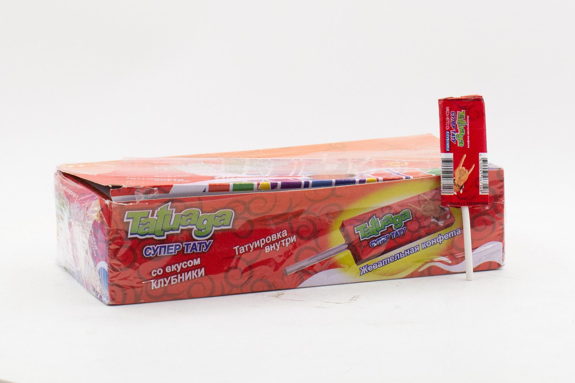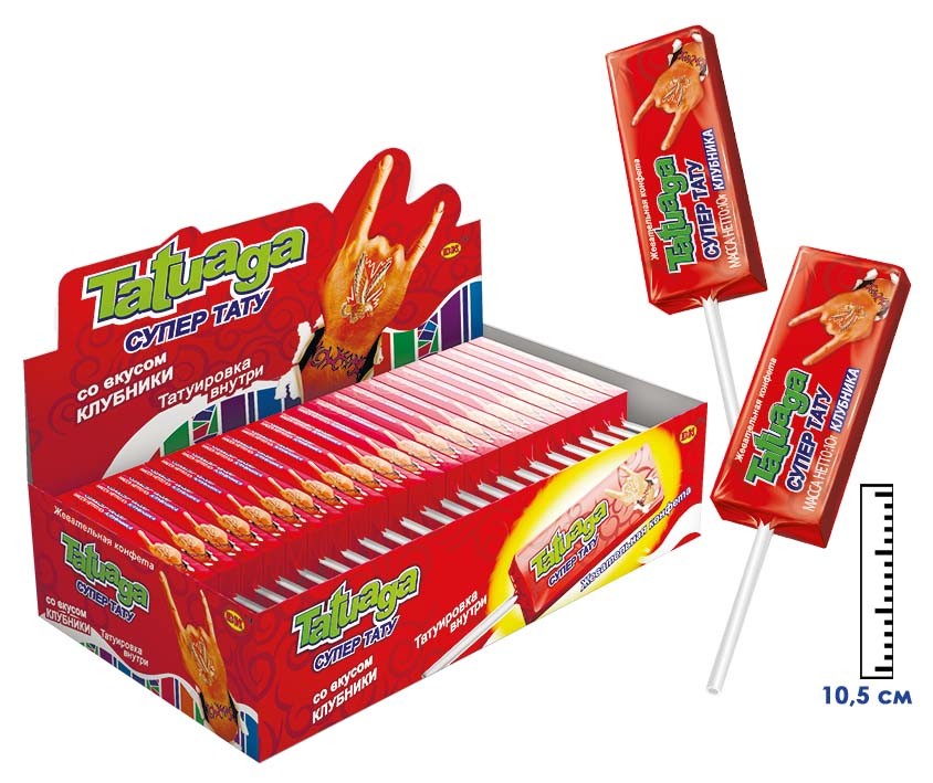 Жевательная конфета на палочке Tatuaga с тату Клубника (Пакистан) 10г5,30 руб. за штуку (в упак. 50 шт.) |